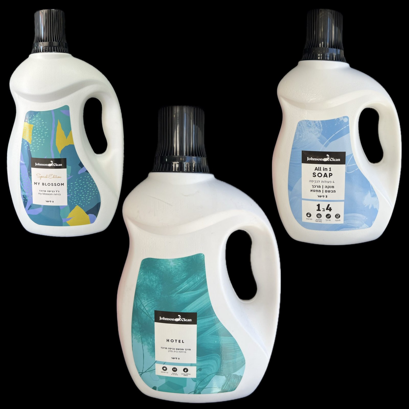 ثلاثة منتجات مختلفة من منظفات الغسيل من علامة “جونسون كلين”، يتميز كل منها بخصائص مميزة: