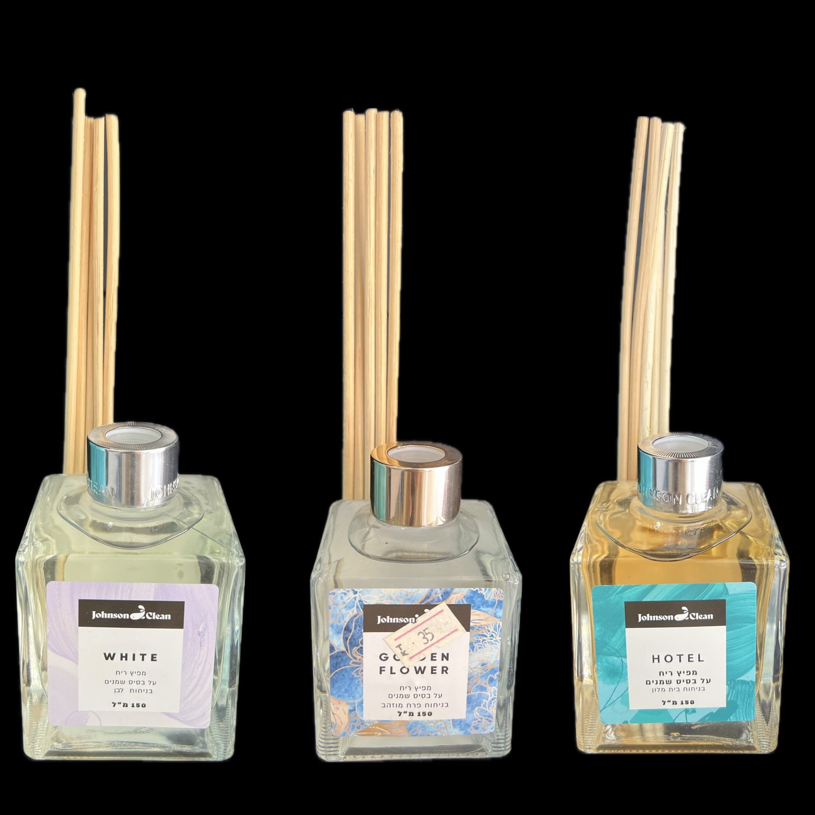 ٣ أنواع فواحات عطرية بالعصي الخشبية (Reed Diffuser) من ماركة Johnson Clean، وهي منتجات لتعطير البيت بطريقة ثابتة وناعمة.
